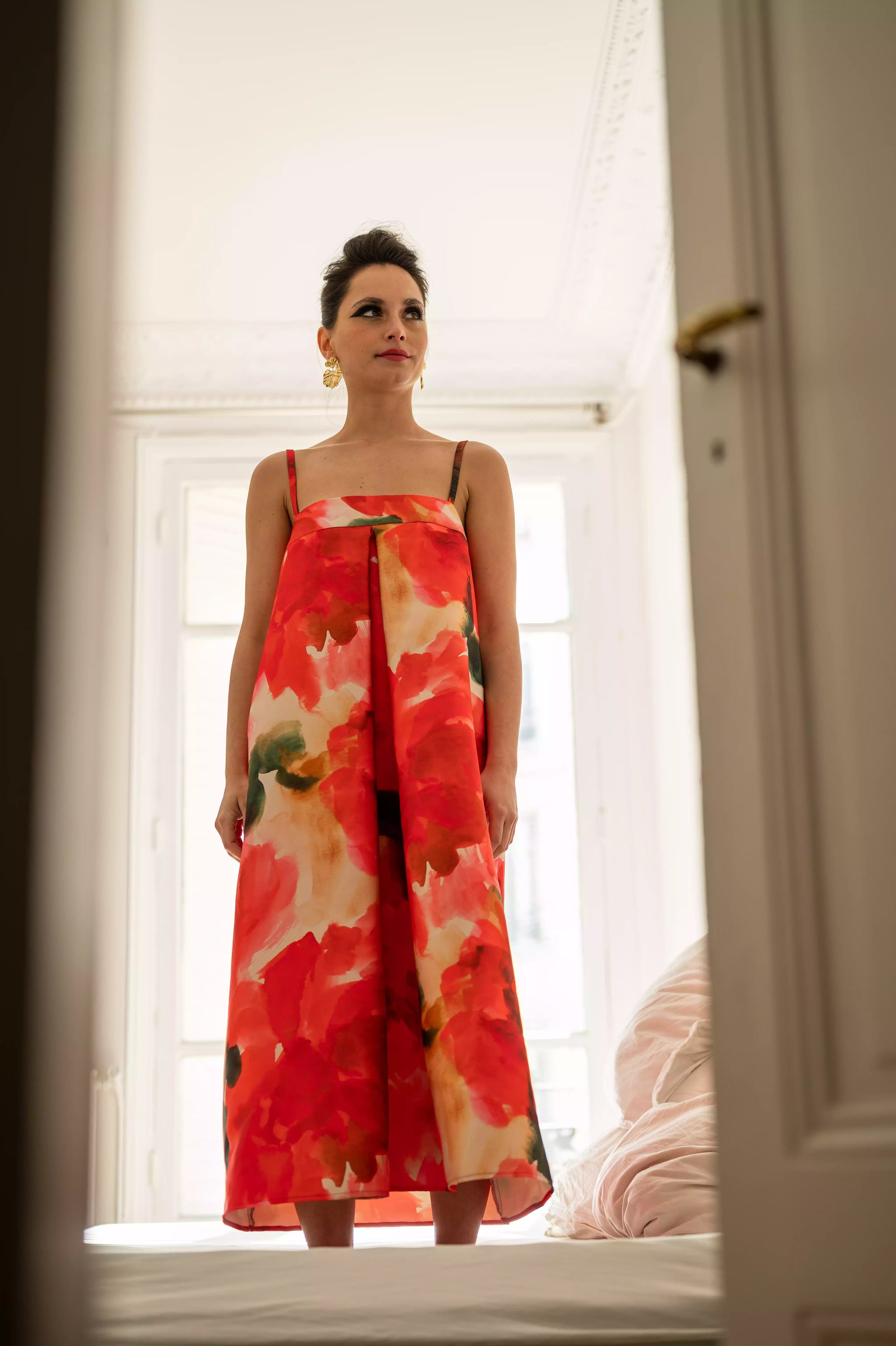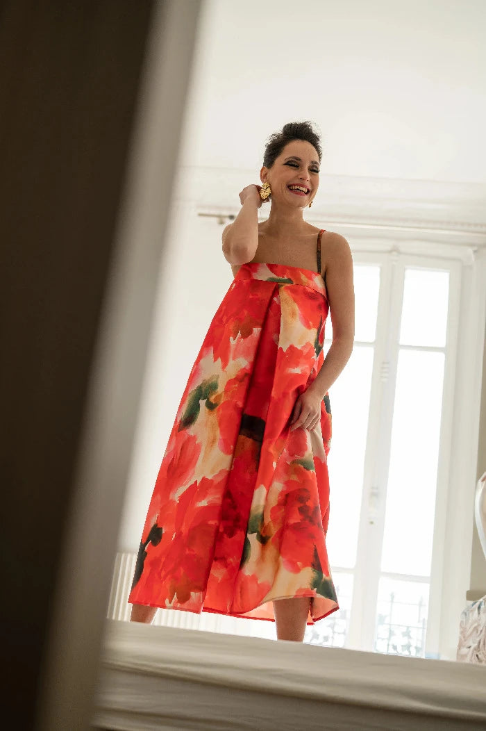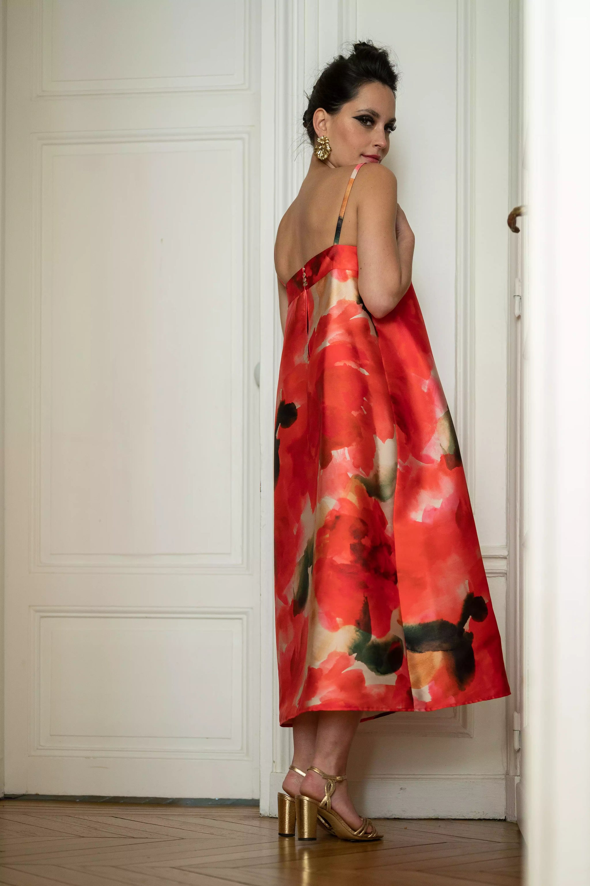Cette robe mi-longue est conçue avec des bretelles fines et une coupe droite qui tombe avec élégance sur la silhouette. L'imprimé est audacieux et artistique, avec de larges touches de rouge, orange, et noir, qui ressemblent à des fleurs abstraites, donnant à la pièce un caractère vibrant et captivant. À l'arrière, la robe propose une découpe basse avec une fermeture boutonnée, offrant une allure délicate et une touche de raffinement.