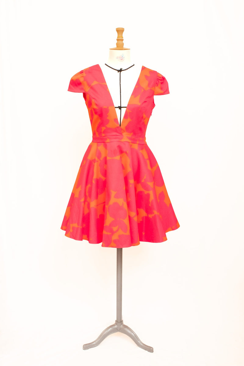 Cette robe Joviale de la marque L'Amusée est une pièce élégante et vive, de couleur rose avec des motifs floraux orange. Elle présente un décolleté en V profond, des manches courtes légèrement bouffantes, et une jupe évasée qui ajoute une touche de légèreté. La robe est cintrée à la taille, mettant en valeur la silhouette.