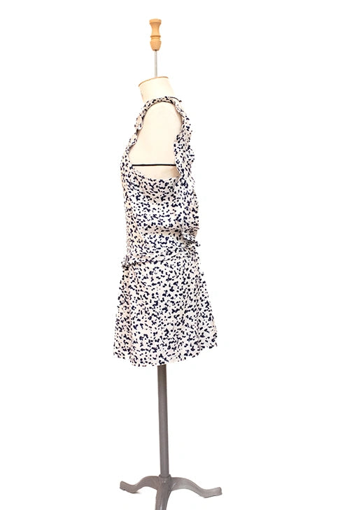 Cette robe d'été présente un motif avec de jolies taches bleues sur un fond blanc audacieux, idéal pour les sorties décontractées ou les événements plus habillés. La robe est sans manches, avec de fines bretelles qui assurent un ajustement confortable. Sa coupe cintrée met en valeur la silhouette, et son dos nu ajoute une touche de sensualité.
