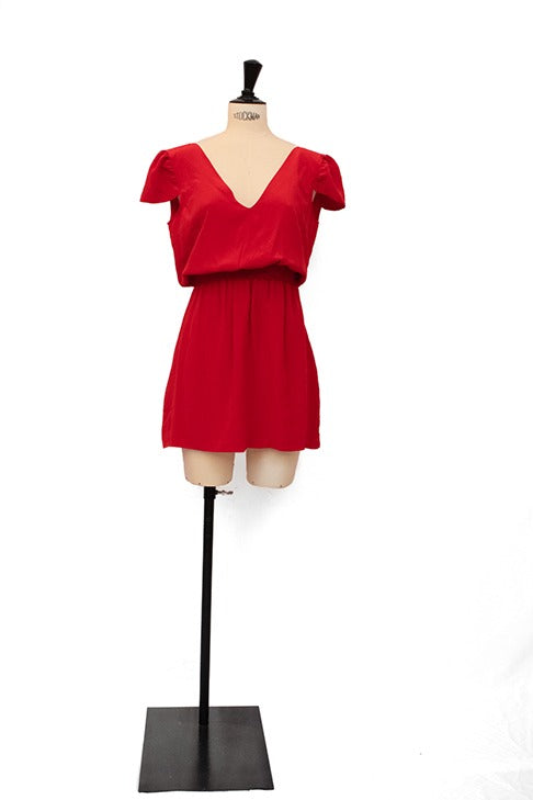Robe courte en polyester rouge dotée d'une coupe fluide. Il s'agit là d'une silhouette raffinée avec un col en V profond à l'arrière qui ajoute une touche de sensualité. La taille élastique assure un ajustement confortable et flatteur. Parfaite pour les soirées d'été ou les occasions spéciales, cette robe combine confort et élégance avec une couleur vibrante qui ne passera pas inaperçue.