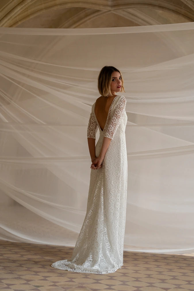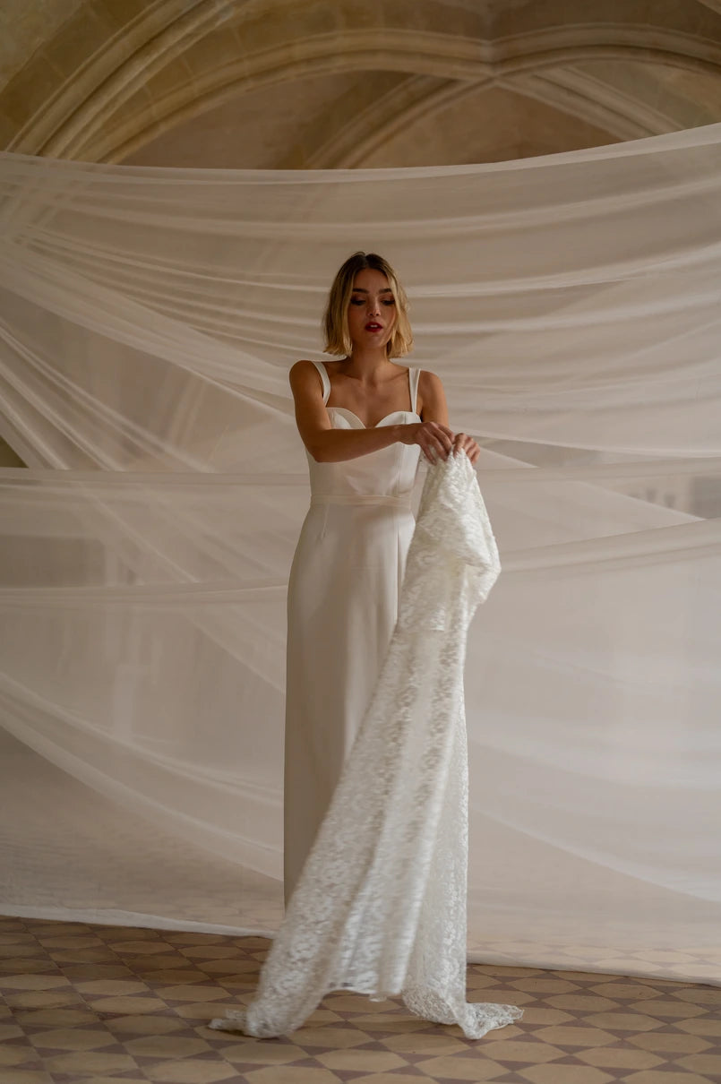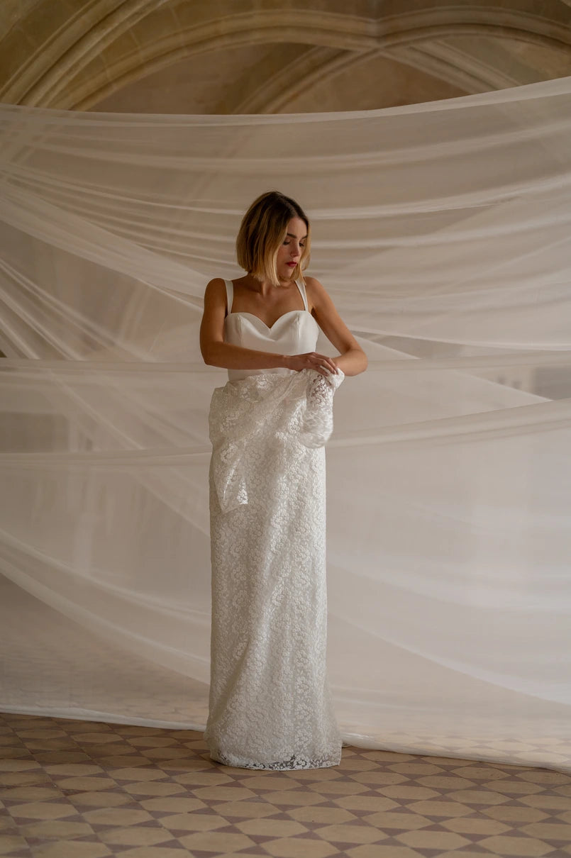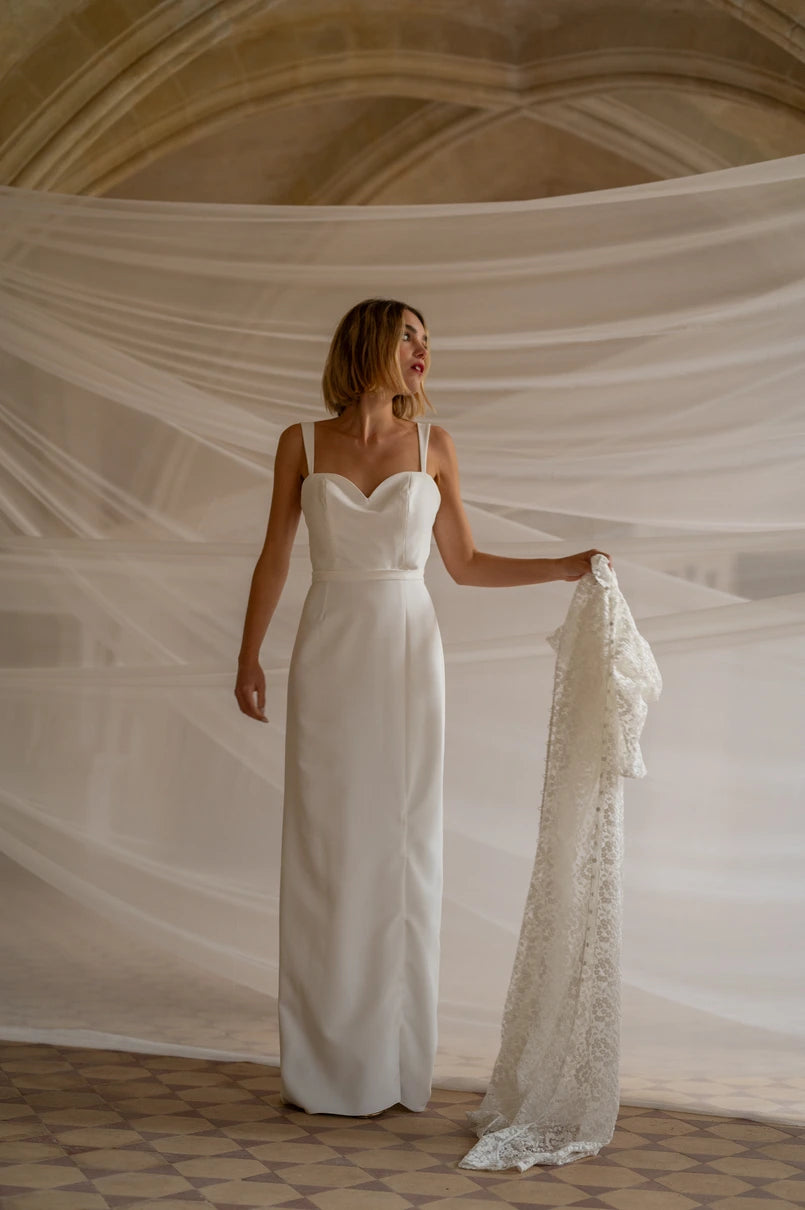 Robe de mariage à bretelles, décolleté coeur et dos nu à porter avec une robe ou un top en dentelle en superposition pour un look 2 en 1 ou à porter seule pour une tenue tout en simplicité.