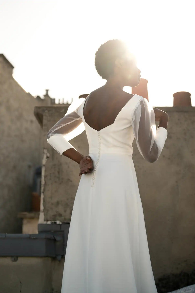 Cette robe de mariée allie la modernité d’un décolleté carré à la légèreté romantique des manches bouffantes en organza. La structure de la robe, à la fois minimaliste et féminine, met en valeur la silhouette tout en jouant sur la transparence subtile des manches.