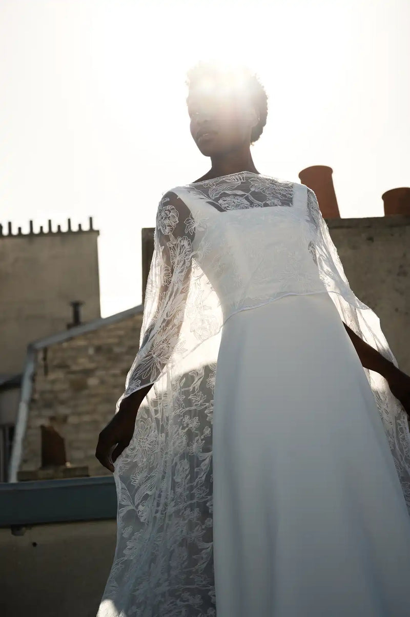 Découvrez cette robe de mariée moderne et aérienne, pensée pour les femmes en quête d’élégance et de singularité pour leur grand jour. Confectionnée en crêpe fluide et agrémentée d’un voile-cape en mousseline de soie fleurie, elle allie pureté et délicatesse des détails.