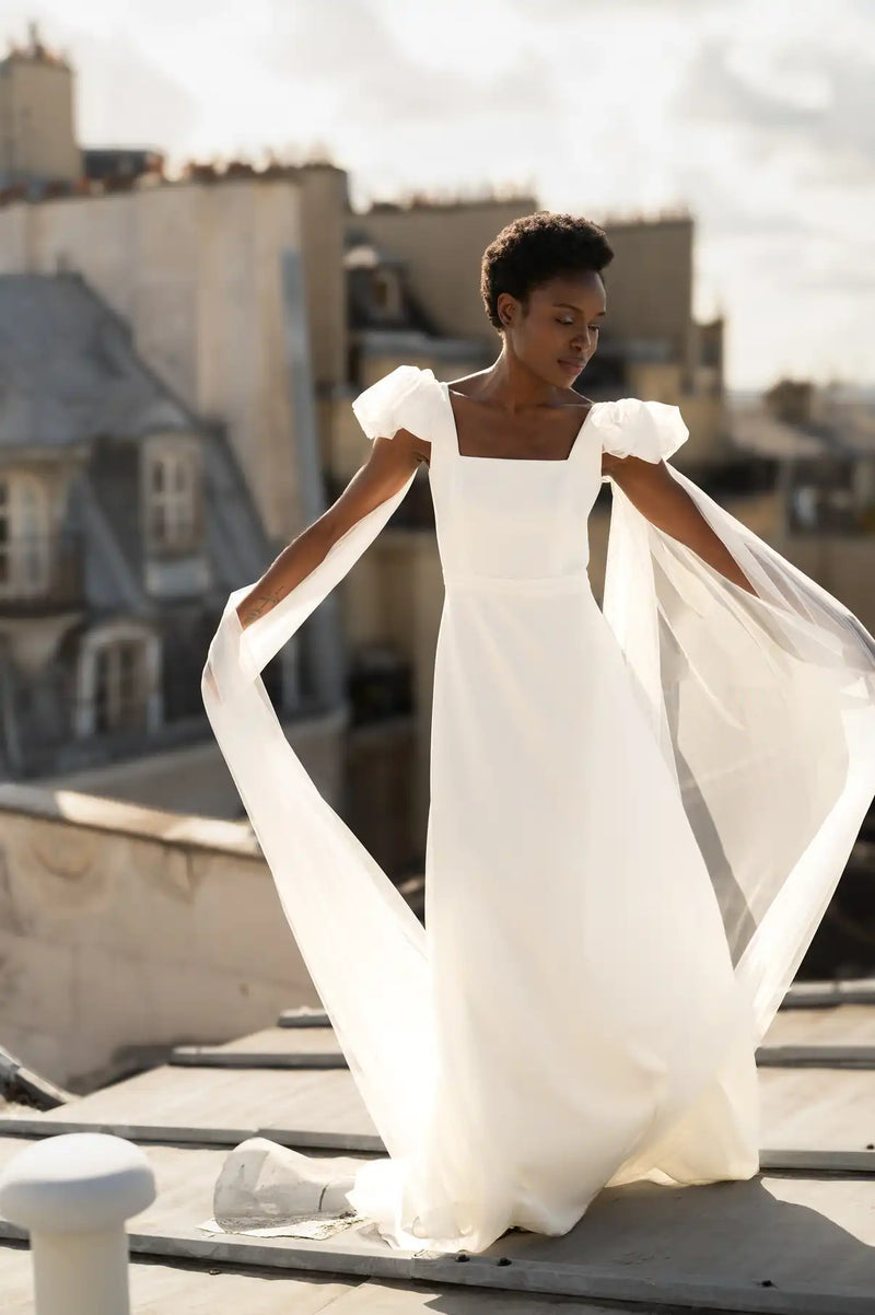 Cet ensemble de mariée incarne la simplicité d’une robe épurée.