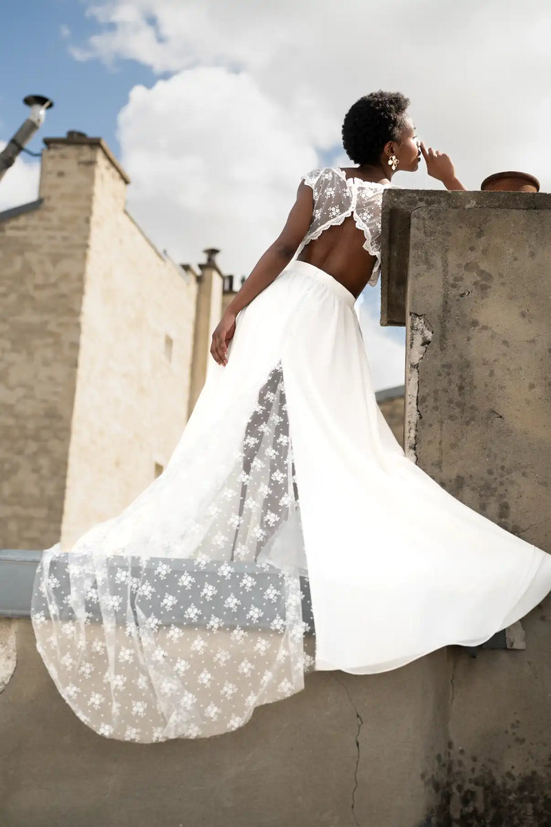 Cette jupe associe la pureté d’un crêpe fluide à la délicatesse d’un tulle brodé fleuri. Sa fente sur le devant laisse entrevoir le tulle transparent, jouant subtilement entre sensualité et raffinement. La coupe évasée allonge la silhouette et se termine par une traîne discrète et élégante.