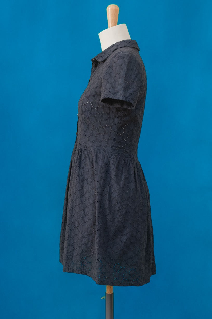 A la fois décontracté et sophistiqué, la coupe chemisier de cette robe bleue marine en dentelle apporte une élégance intemporelle. Les manches courtes complètent harmonieusement le style, offrant une couverture légère tout en permettant une aisance de mouvement.
