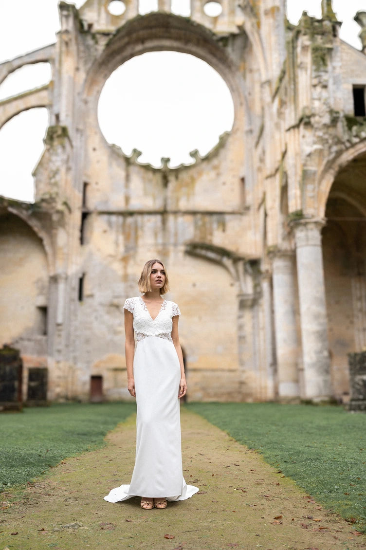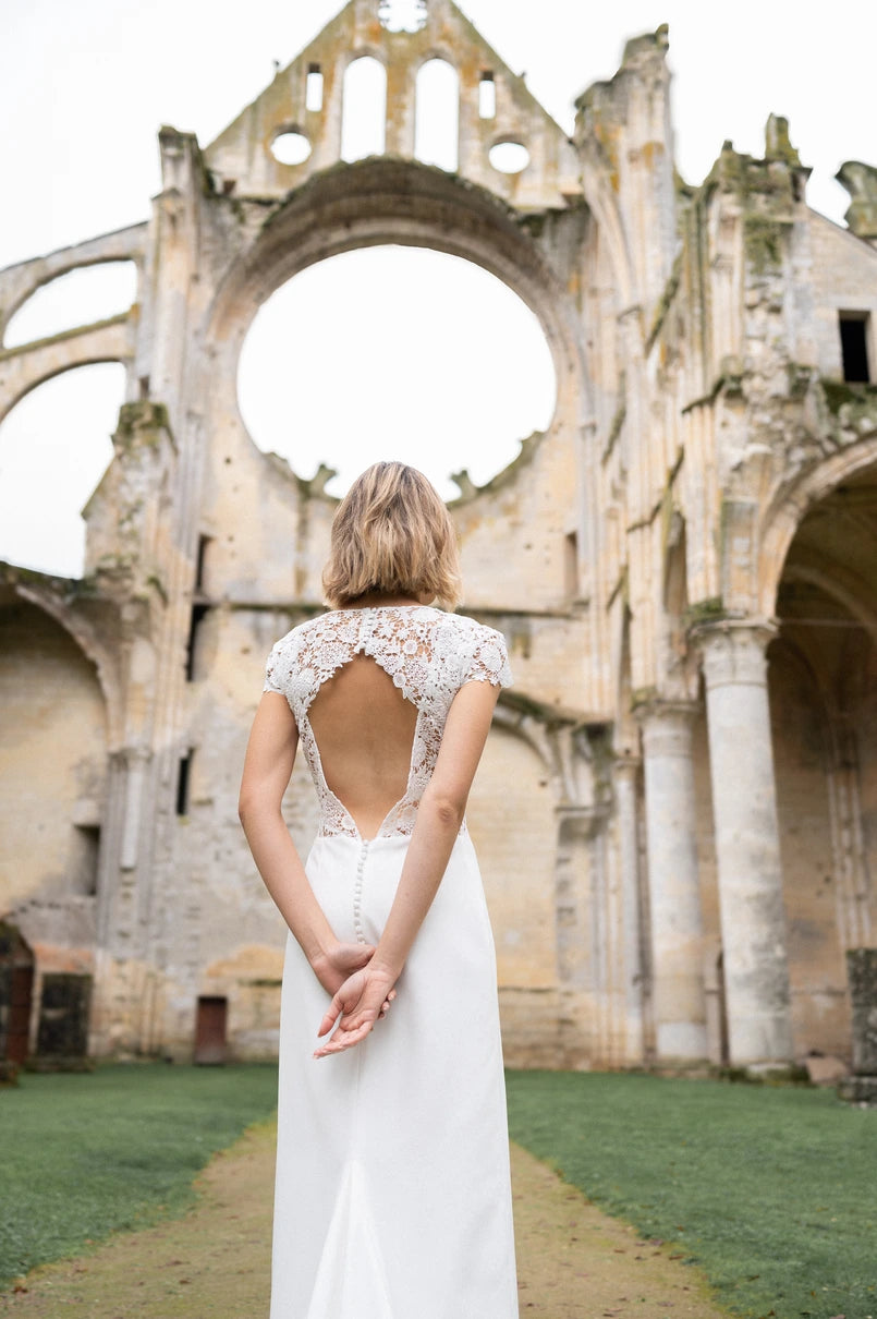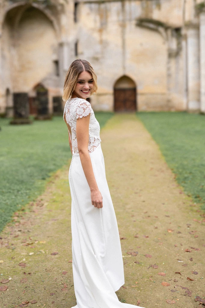 Le top en guipure, délicatement posé sur la robe, est entièrement amovible. Cela permet de révéler un dos nu et un décolleté audacieux, pour un changement de look subtil mais spectaculaire durant la journée ou la soirée
