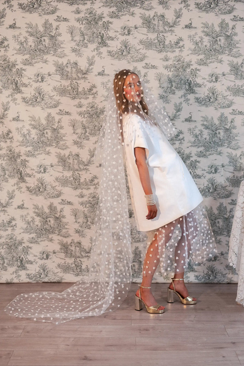Délicat et résolument moderne, ce voile en tulle plumetis se distingue par ses motifs en forme de cœurs, apportant une touche poétique et espiègle à la silhouette. Léger et aérien, il accompagne les mouvements avec douceur tout en laissant deviner la tenue.✨💓